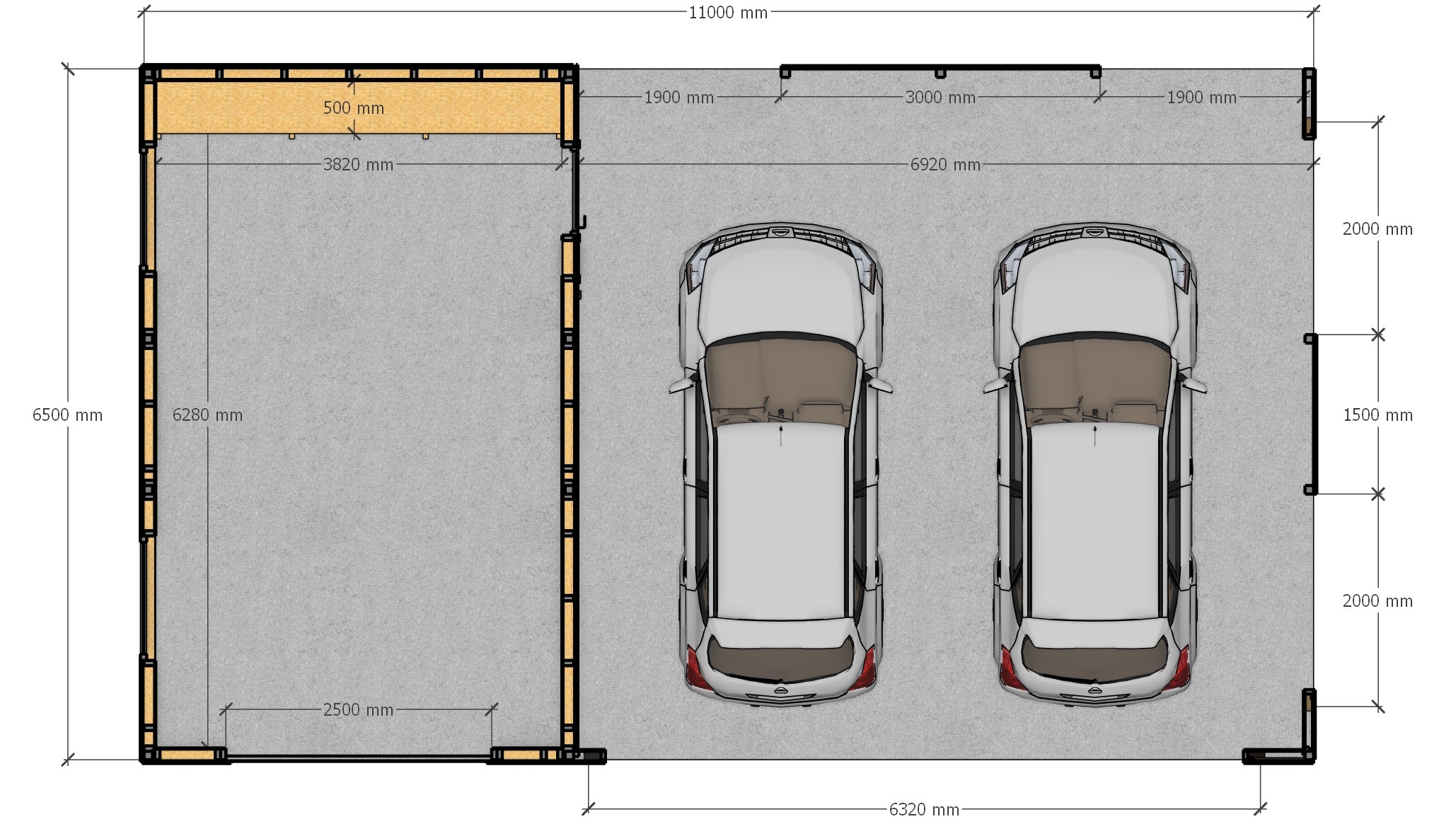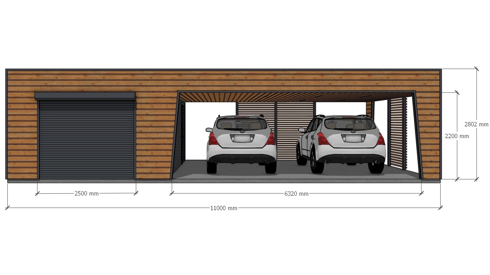 Гараж с навесом Хайтек 11,0х6,5м на три авто (электропривод ворот и кронштейн для колес в подарок)
