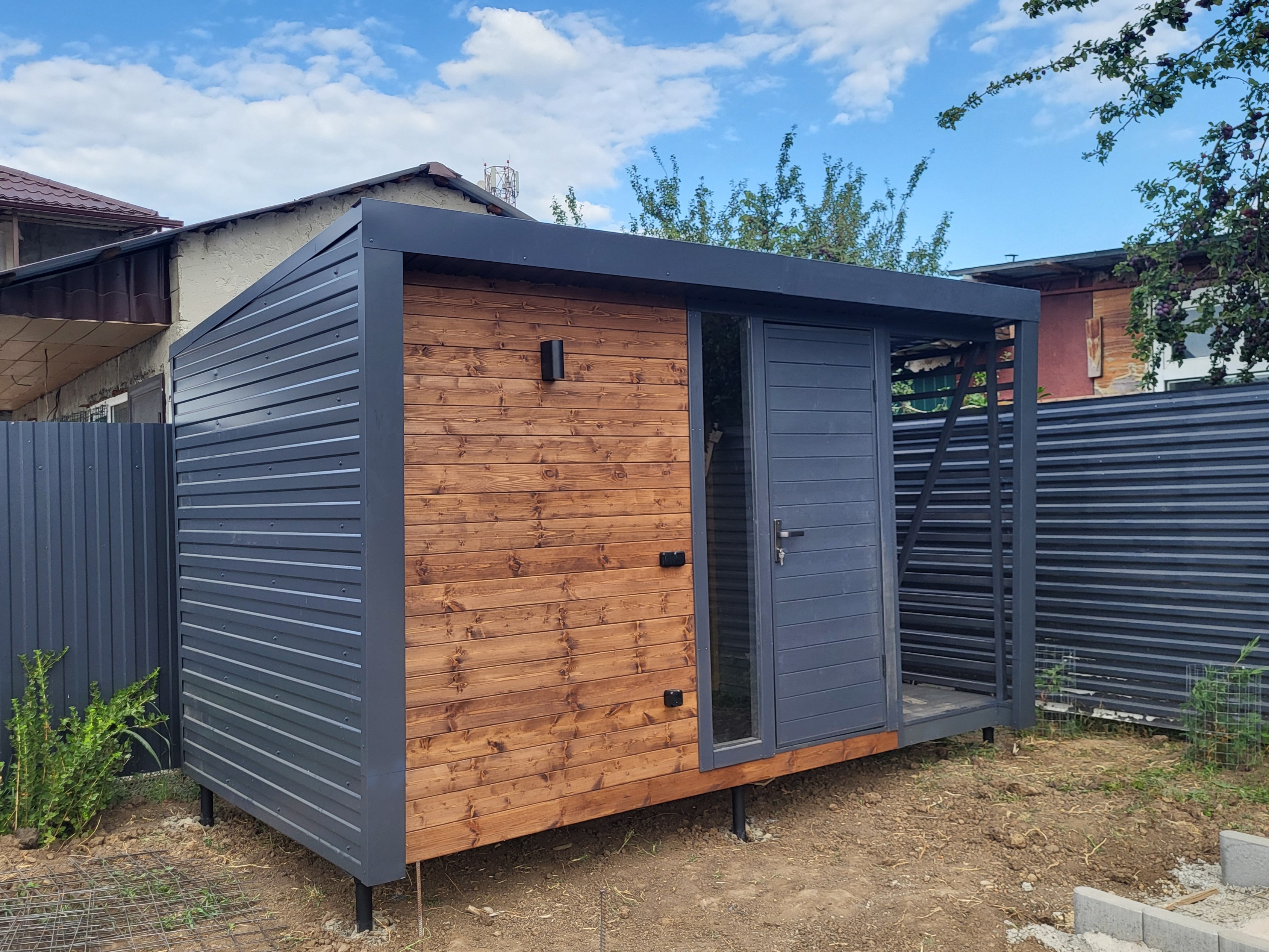 ХОЗБЛОК 2,5х4,0м с дровником 1м и обшивкой из профлиста (стеллажи в комплекте)