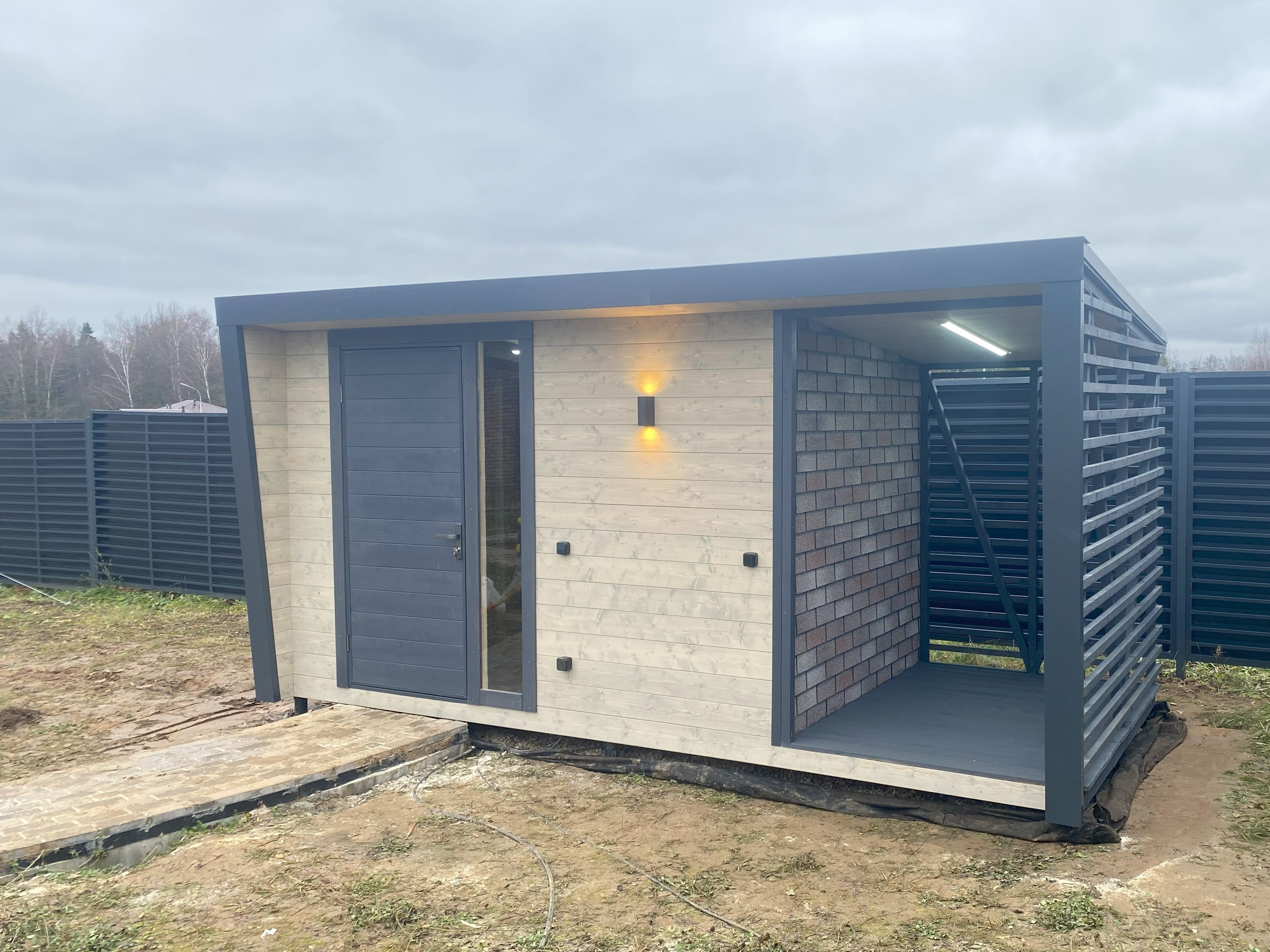 ХОЗБЛОК 2,5х5,0м с дровником и обшивкой стен из гибкой черепицы (стеллажи в комплекте)