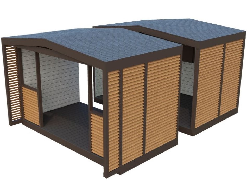 Привозим два модуля размерами 2,5х4,0м, стыкуем их на свайном фундаменте и стелим единую кровлю.