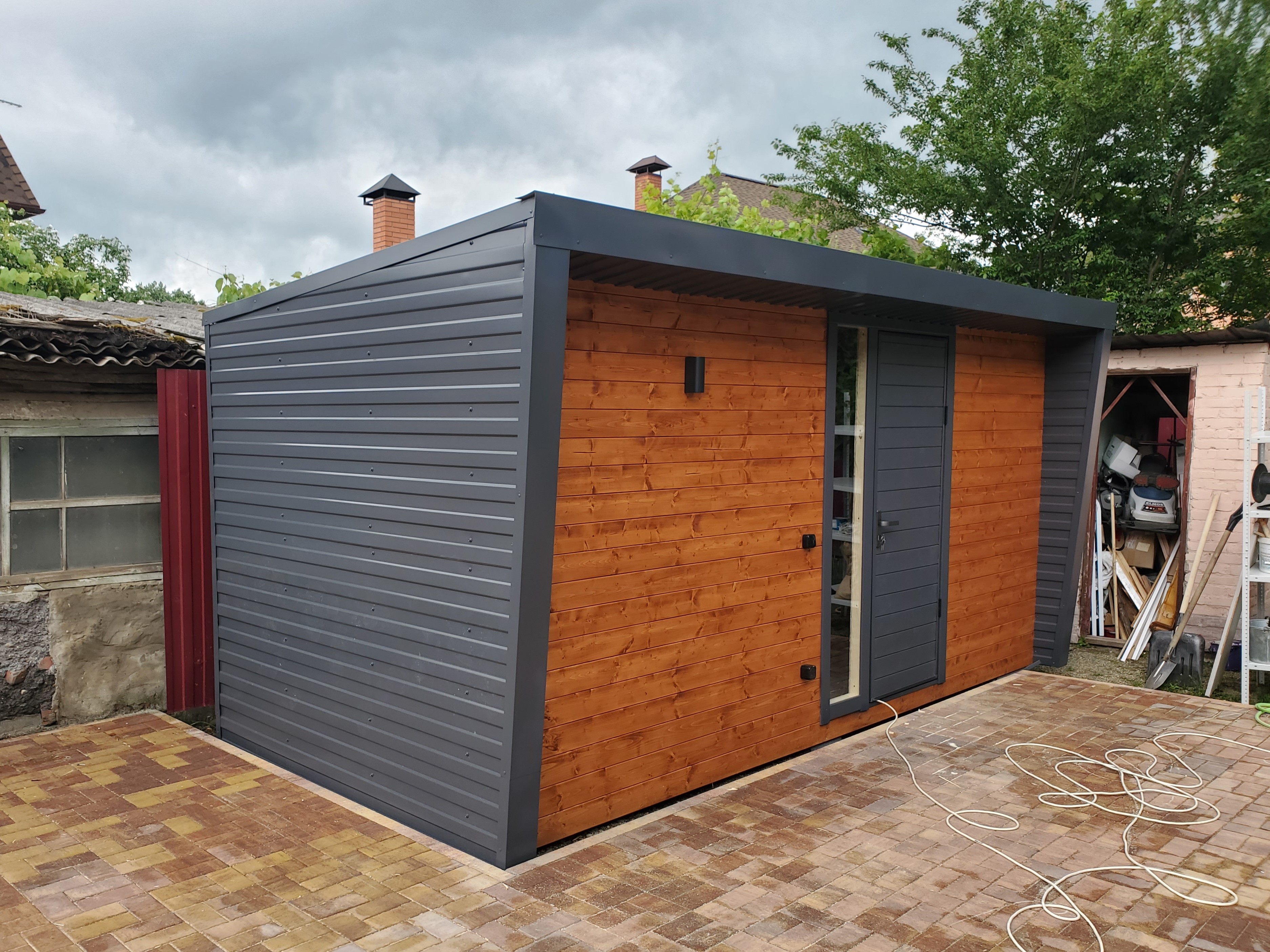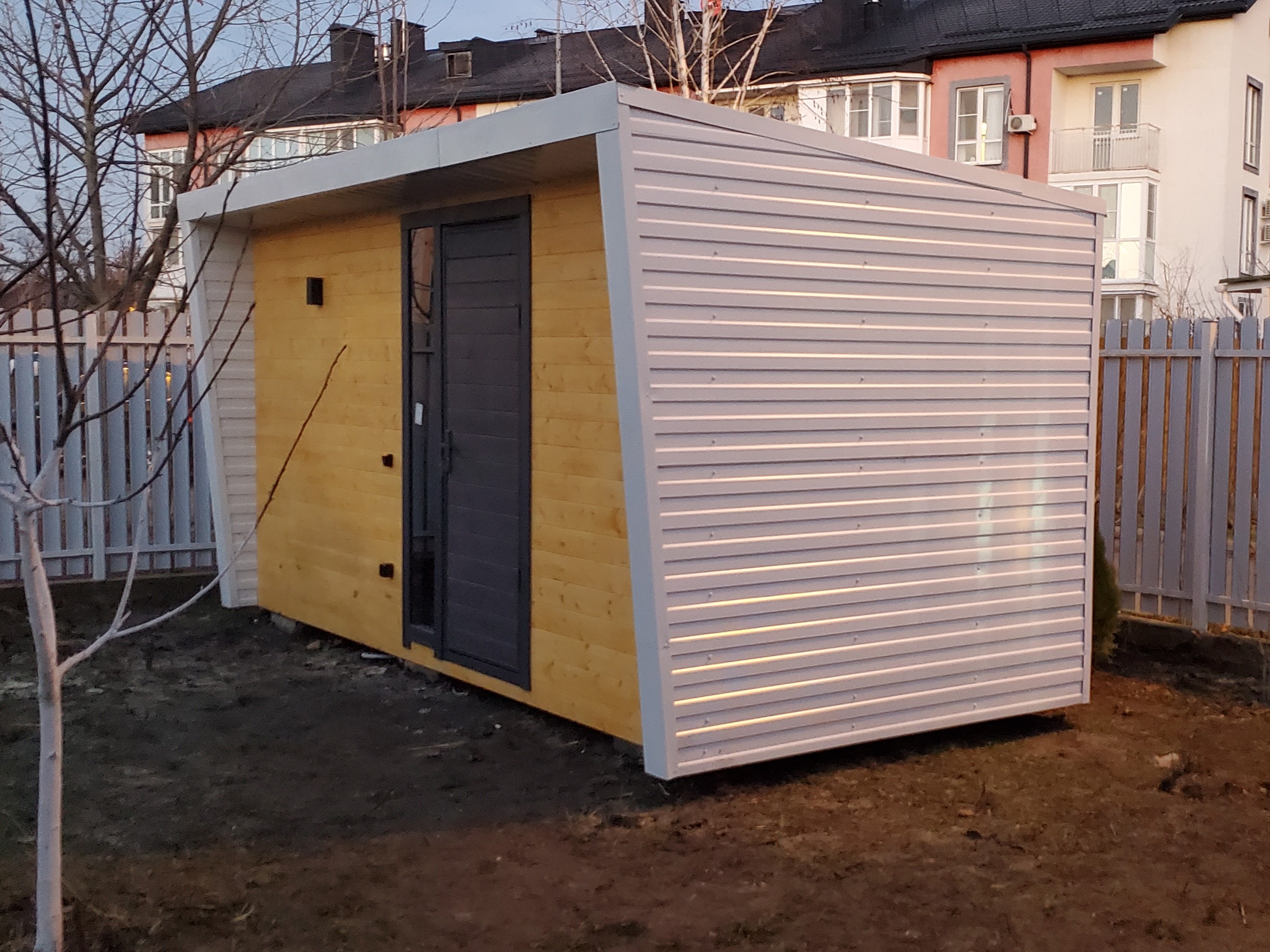 Второе фото - внутри хозблока с обшивкой стен из профлиста.