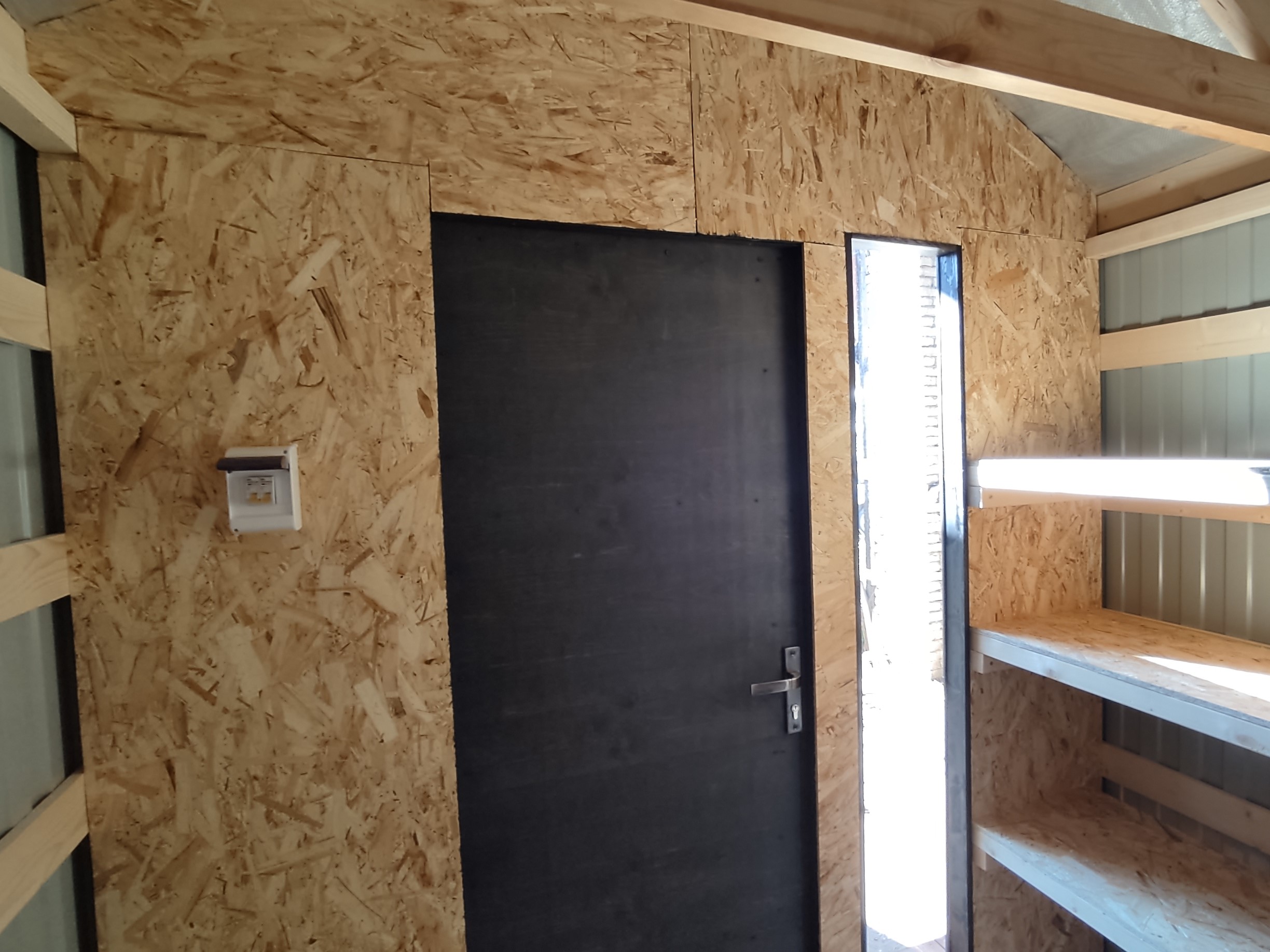 Слева фото внутри хозблока с обшивкой стен из профлиста.