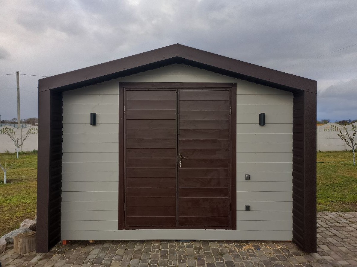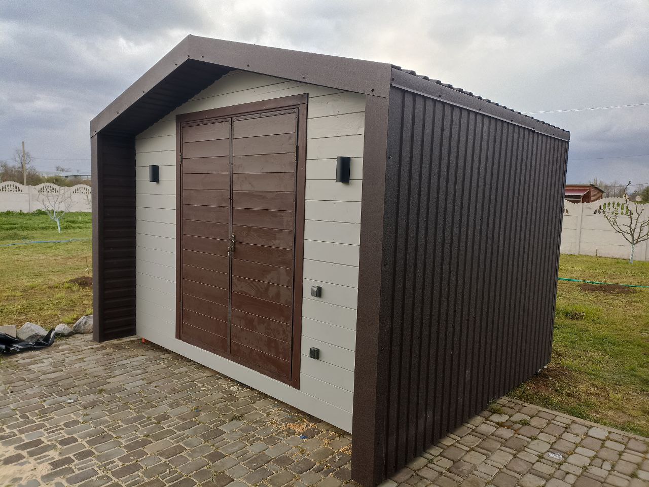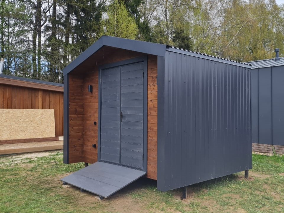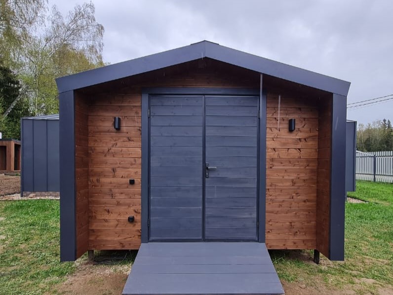 Наружная обшивка стен выполнена долговечным профлистом. Дверь распашная в стандарте с проемом шириной 150см.