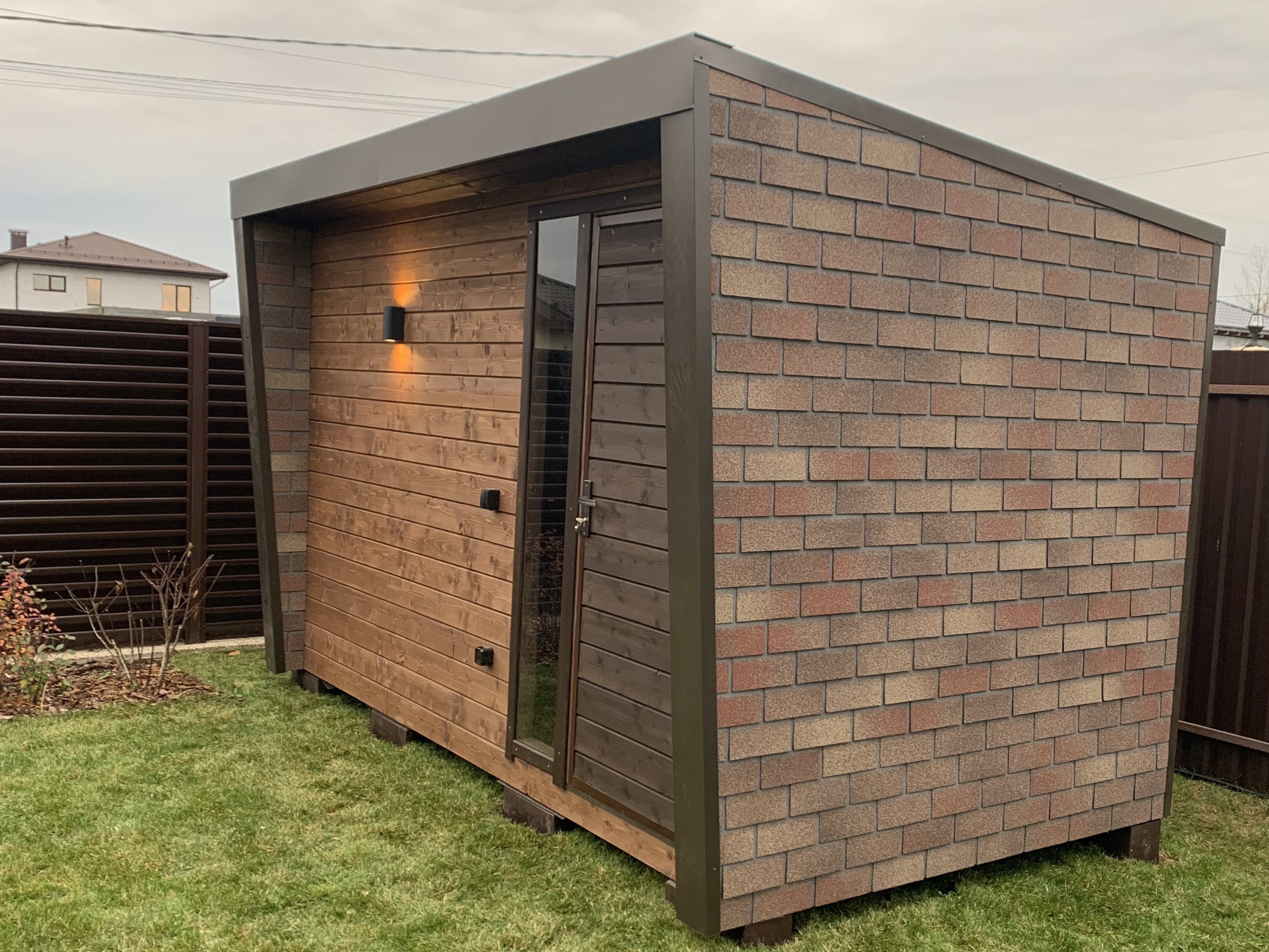 Высота хозблока снаружи: 220см по низкой стороне, 240см по высокой стороне.